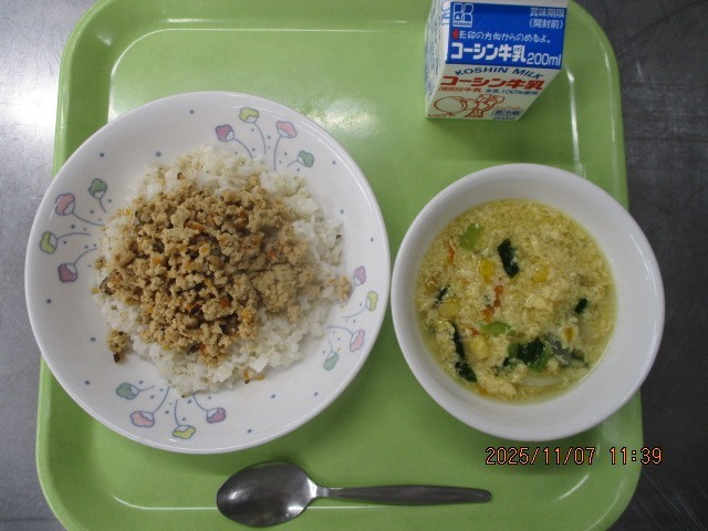 高野豆腐のそぼろ丼 たまごとコーンのスープ 牛乳