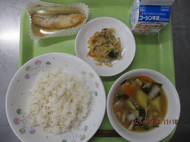 ごはん たらの醤油麹焼き 野菜のごま酢和え みそ汁 牛乳