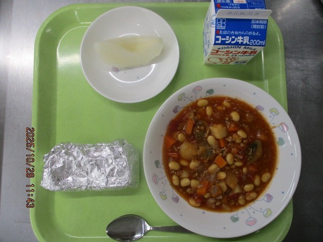 ねりごまトースト チリコンカン 梨 牛乳