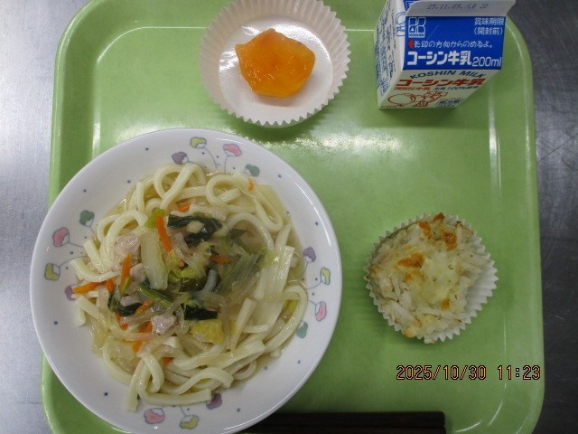 あんかけうどん ポテトのチーズ焼き 柿 牛乳