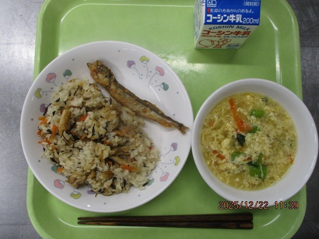 磯おこわ ししゃものスパイシー揚げ かきたま汁 牛乳