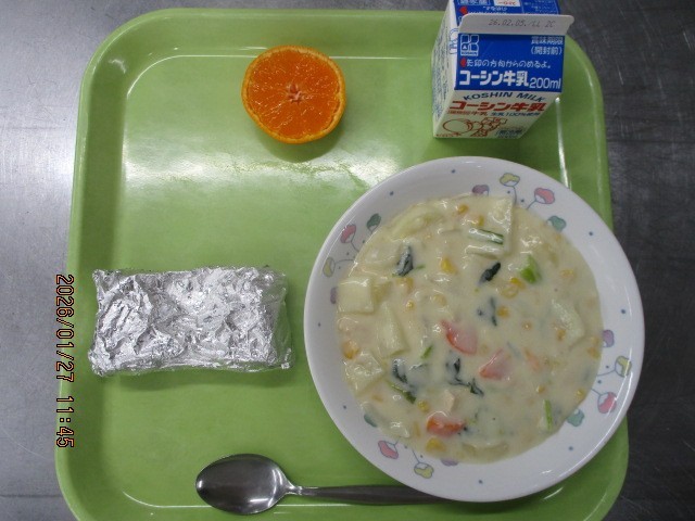 ガーリックトースト 米粉のシチュー みかん 牛乳