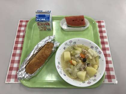 今日の給食は「ピザドッグ さっぱりポトフ すいか」です。