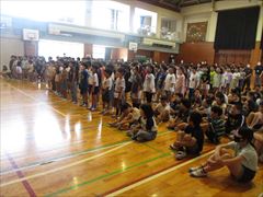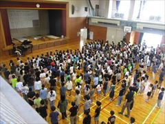 音楽朝会の様子、その2です。1〜4年生が主旋律を歌い、5〜6年生が副旋律を歌って、体育館に綺麗な歌声を響かせました。