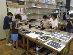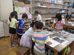 4年生の図工の授業風景です。掘った板にローラーでインクを付けて、版画を何枚も作成しています。(校長)