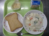 今日の給食は「ごまハニートースト ミネストラスープ フレンチサラダ」です。