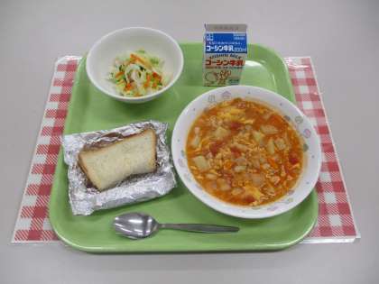 甘くておいしいごまハニートースト、トマト味のミネストラスープ、玉ねぎのはいったフレンチドレッシングのサラダと今日もおいしい給食の出来あがりです