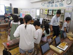 音楽の授業観察の様子、その2です。最初にデジタル教材を使ってタブレットで音階を組み合わせ、次に琴や鉄琴、電子ピアノなど、自分が使いたい楽器を使って音を鳴らすなど、試行錯誤をしながら、自分だけの日本の旋律を作っていました。(校長)