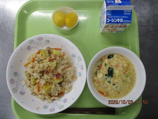 吹き寄せごはん かきたま汁 お月見だんご 牛乳