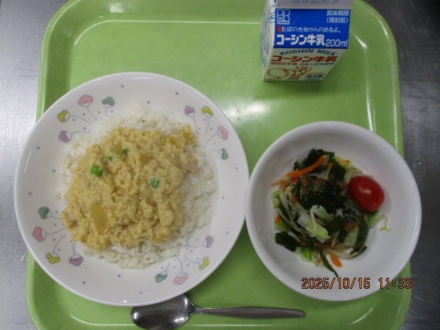 高野豆腐入り親子丼 野菜のごま酢 ミニトマト 牛乳