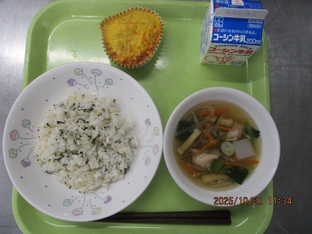 ゆかりごはん 中華風たまご焼き 丸ごとわかめスープ 牛乳