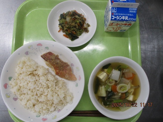 ごはん 赤魚のごまみそ焼き いそか和え けんちん汁 牛乳
