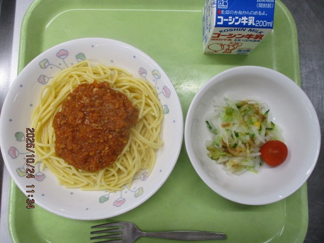 スパゲティミートソース ゆうすげ村のダイコンサラダ ミニトマト 牛乳