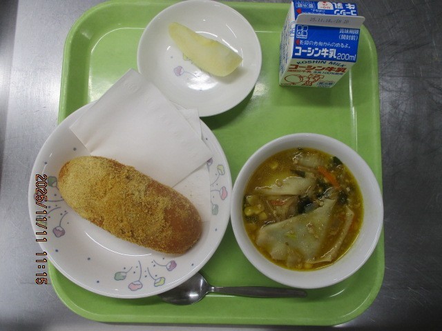 きなこ揚げパン みそワンタンスープ りんご 牛乳