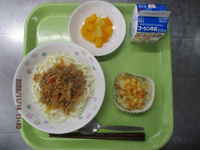 肉みそあんかけうどん ポテトのチーズ焼き フルーツミックス 牛乳