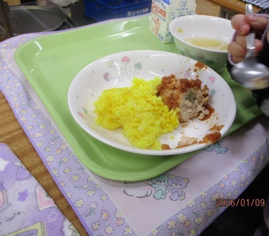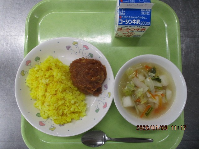 おめでターメリックライス おみくじミートボール 冬野菜のぽかぽかスープ 牛乳