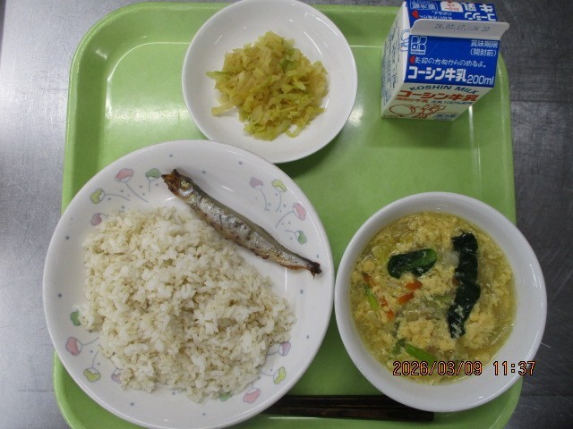 ごはん ししゃものピリ辛焼き たまごスープ キャベツのからしじょうゆ 牛乳