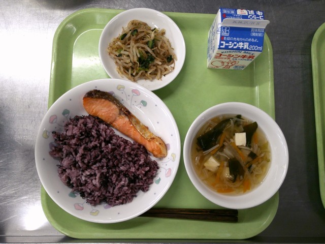 今日は、入学・進級祝いの行事食で、黒米を炊き込んだ赤飯です。