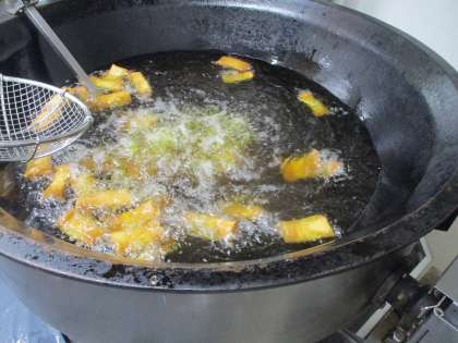 大きな釜で揚げるときも皮がやぶれないようにていねいに扱います。