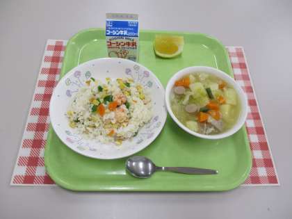 今日の給食は「コーンピラフ ポトフ 美生柑」です。