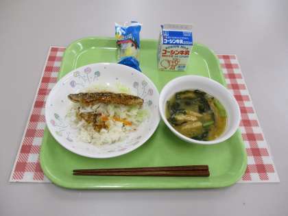 今日の給食は「ごはん さばのみそ煮 かんぴょうの卵とじ汁」です。