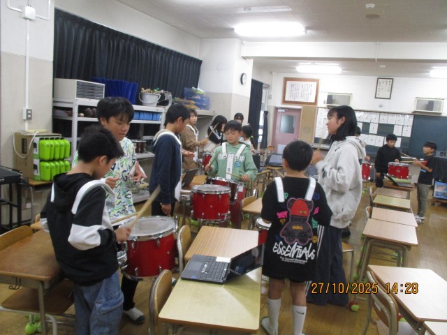 6年生から5年生に楽器やカラーガードなどを引き継ぐための練習が始まりました。