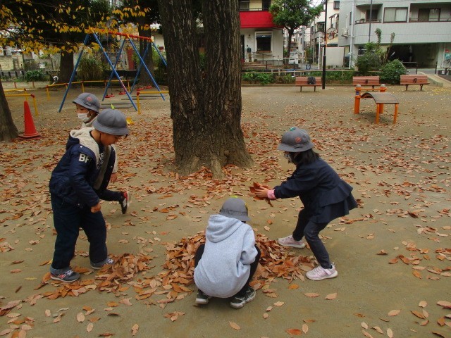 また、公園で色づいた葉などを見つけ、自然の移り変わりの様子も感じていました。