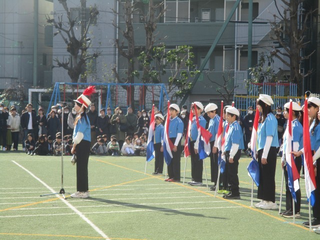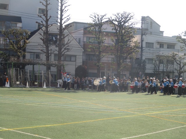 全校児童や保護者の方々に見守れる中、鼓笛隊が6年生から5年生へ引き継がれました。