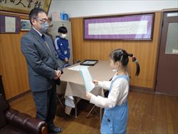 今年度で日本語の学習を修了する児童が校長室で作文を発表した後、校長先生から修了証を受け取りました。