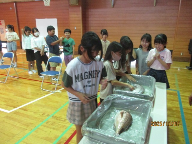 10月6日の3・4時間目に愛南町ぎょしょく伝道師の方に来ていただいて、漁業についてのお話を伺いました。カツオの一本釣りで使われる竿を持たせてもらったり、天然の鯛と養殖の鯛を間近で比べたりしました。その後の給食は、愛南町で養殖されたタイを使った鯛飯でした。おいしくて、クラスの食缶はあっという間に空になりました。