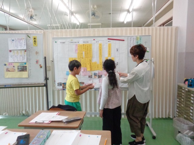 10月15日(水)に今年度の本校の研究主題「主体的に取り組み、共に学び合える子」~自らの学びを振り返り、「教わる」から「学ぶ」へ~をもとに4年1組で研究授業を行いました。授業の内容は、国語科の単元名「和室と洋室のよさをしょうかいしよう」です。また、4年1組から日本語学級に通っている4名の児童も同じ学習を日本語教室で行いました。