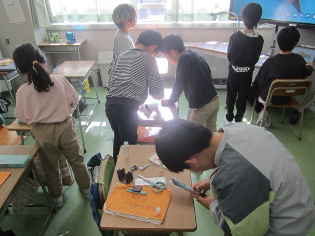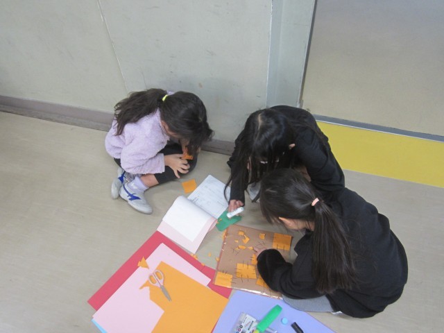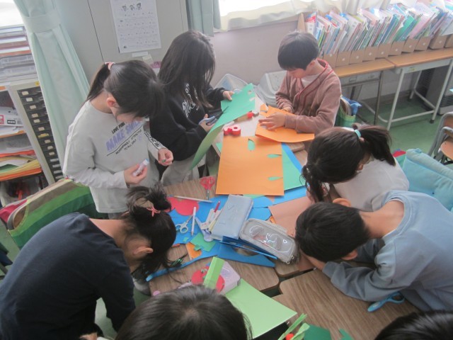 これまでの時間では、役を決めたり、登場人物の気持ちを考えたりしてきましたが、今回はそれぞれの役に分かれて小道具づくりを行いました。子どもたちは「子ども役はおもちゃを持った方がいい!」「執事にはハンカチが必要!」「魚屋には出刃包丁があると本格的!」など、想像力いっぱいのアイデアを出し合いながら作業を進めました。