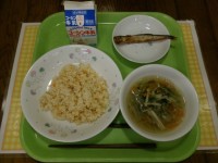 ★今日の給食★牛乳にんじんごはんししゃものスパイシーあげさわにわん★食材の産地★人参:千葉県 ごぼう:青森県長ねぎ:栃木県 大根:千葉県水菜:茨城県ししゃも:ノルウェー
