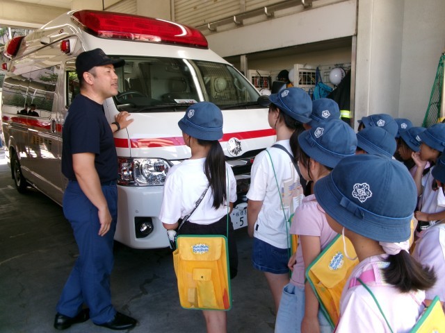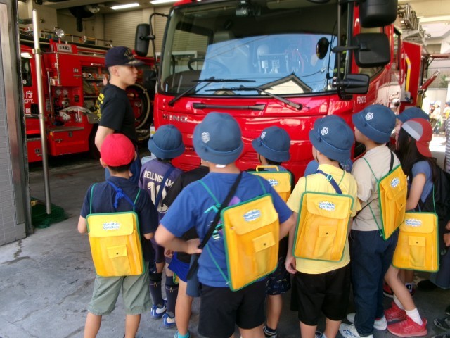 消防車や救急車の秘密を詳しく教えてもらったり、消火器体験をしたりしました。