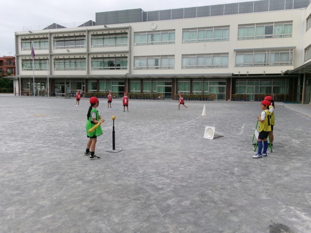 3年生では校庭体育で「Tボール」しています。