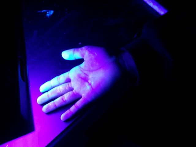 本日は、蛍光クリームとブラックライトを使って菌の広がる経路について体験したり、「ミルキン」という道具を使って教室内の菌を見たりと、目に見えない汚れについて理解を深めました。