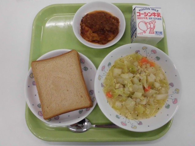 牛乳 黒砂糖食パン 豆腐入り煮込みハンバーグ ABCマカロニスープ