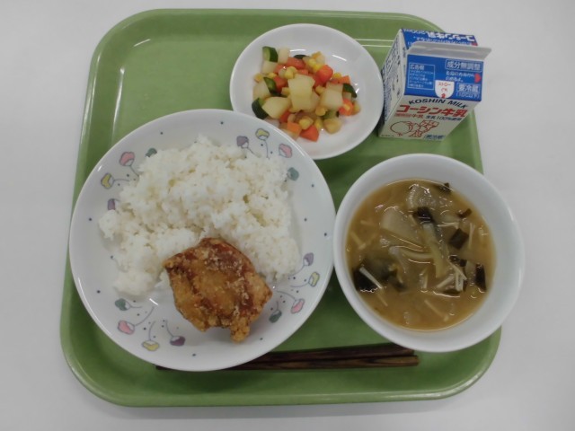 牛乳 ごはん とりのから揚げ サイコロサラダ えのきとわかめのみそ汁