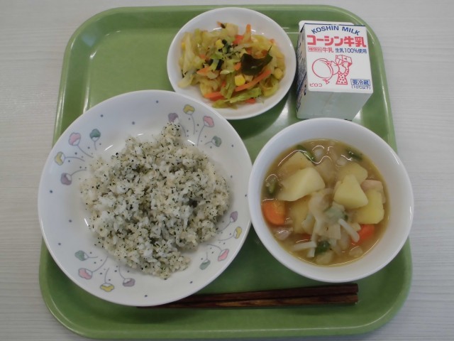 牛乳 かおりごはん 塩肉じゃが カリカリ油揚げのサラダ