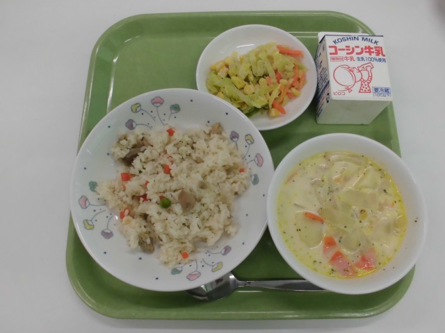 牛乳 さつま町産ごぼうと鶏のピラフ 野菜のクリームスープ ごまドレサラダ
