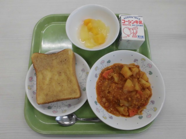 牛乳 セサミハニートースト レンズ豆のシチュー フルーツポンチ