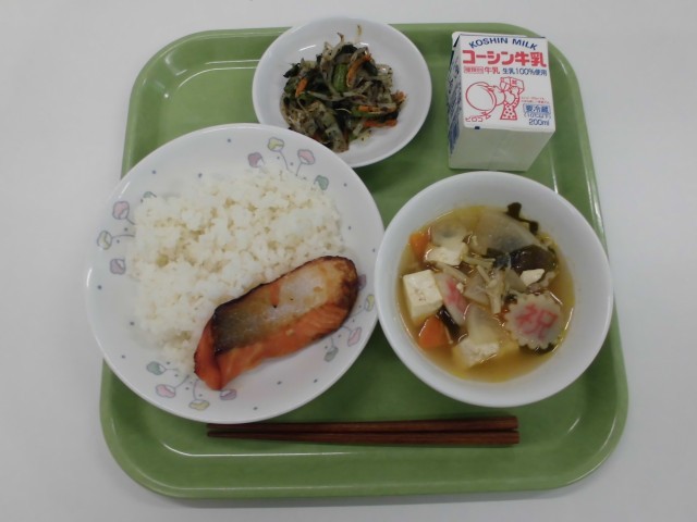 牛乳 ごはん 鮭の西京味噌焼き ゆで野菜ののり和え お祝いすまし汁