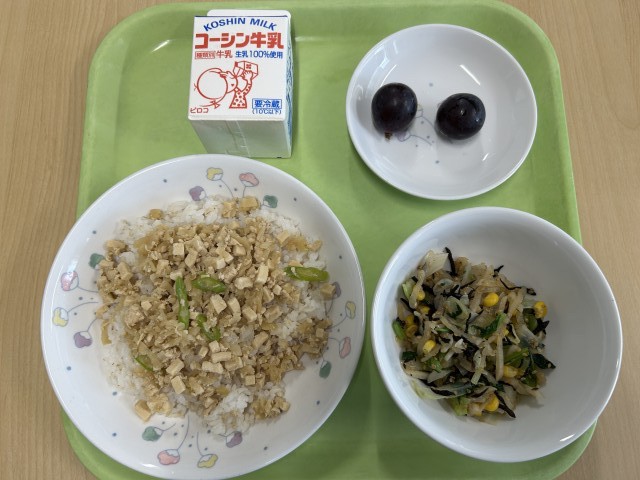 本日のメニュー 切り干し大根入りそぼろ丼、ひじき入りサラダ、くだもの(ぶどう)