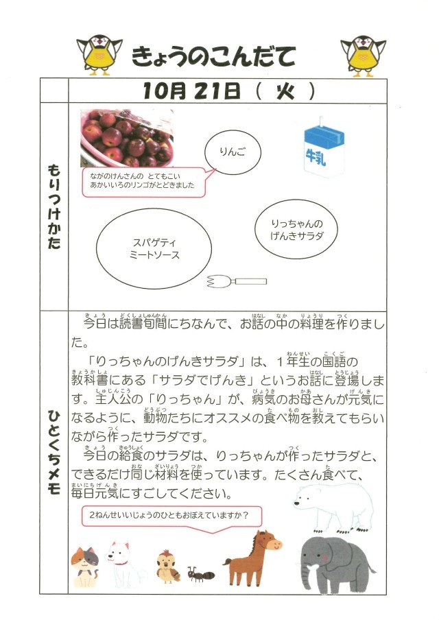 本日の給食献立には、1年生の国語の教科書にも登場する「りっちゃんのげんきサラダ」を出しました。