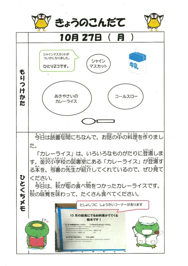 それだけではありません。読書の秋・読書週間にちなんで図書にカレーライスが登場する本を図書室で紹介してくれます。