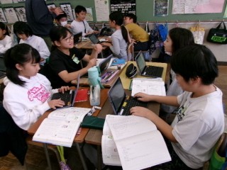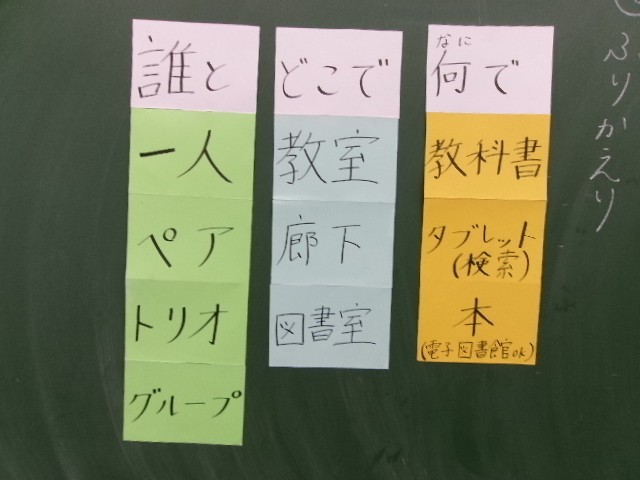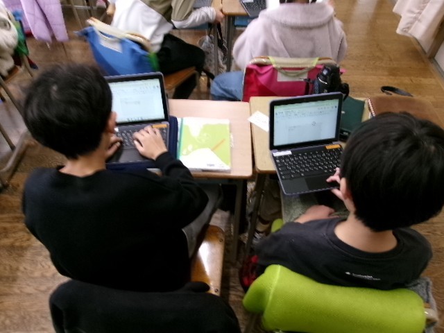 グループで話し合いながら考えたりする子が多くいましたが、中には一人でじっくりと考えていたり、二人で視点や意見を共有し合いながら学びを進める子もいました。今月から新たに配られた一人一台端末も早速、活用しています。