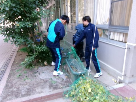 主に体験してもらったのは用務員さんの仕事です。その仕事内容は清掃をメインに多様です。校舎内の清掃はもとより、今の時季は落ち葉が多くあうため長い時間の落ち葉掃きなどを担ってもらいました。写真は4年生が夏に取り組んだ「緑のカーテン」の撤去作業のようすです。用務員さんにやり方を教わりながら、綺麗に撤去をしてくれました。