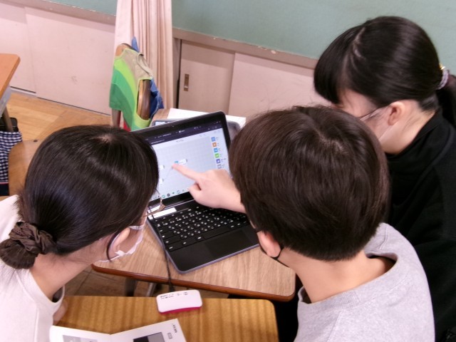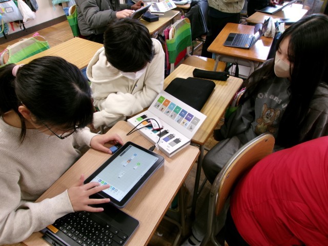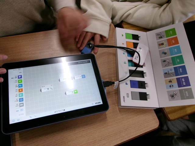 6年生が一人一台端末(Chromebook)へ向かいながら友達同士で話し合い、画面を触っていました。何かと尋ねるとプログラミングをしているとのこと。少し大きめな消しゴム大のワイヤレスブロックが数個あり、これらがボタンやカメラ、温度、明るさ、動きなどのスイッチ、センサーになっていて、一人一台端末(Chromebook)のプログラミンアプリを使ってプログラミングをすることができる教材です。