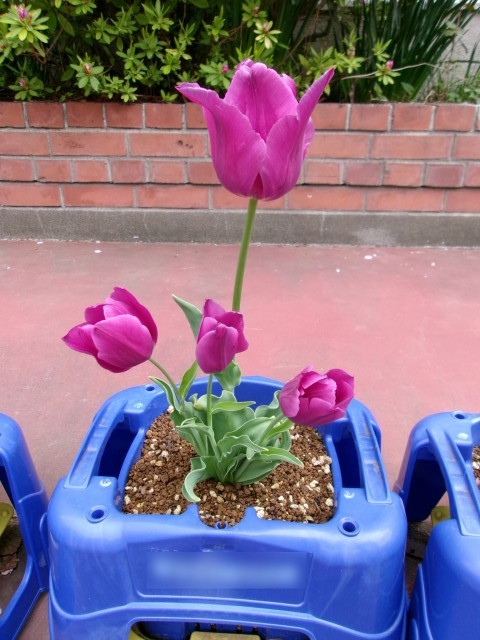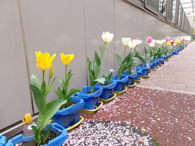 新2~5年生は下校をし、新6年生は入学式に向けて新1年生を迎えてくれました。新1年生は保護者と離れ、新6年生の優しい声掛けを受けながら入場待機場所へ向かいました。入学式で新1年生は「おはようございます。」とみんな揃って元気なあいさつができました。写真のチューリップは、新2,3年生が入学式に向けて育ててきたものです。