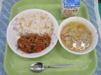 <今日の献立>・ガーリックライス・ポークチャップ・野菜スープ・牛乳